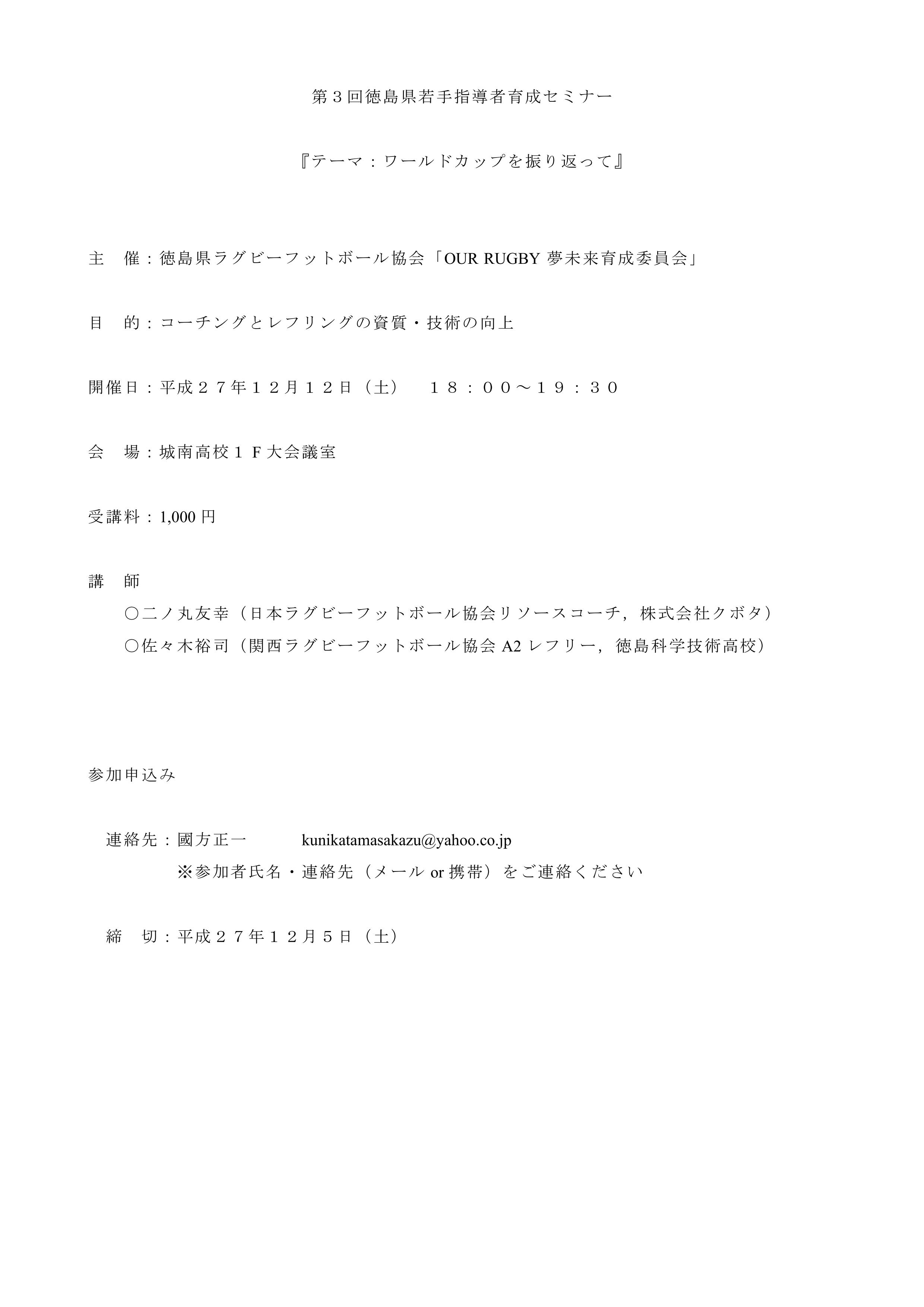第3回徳島県若手指導者育成セミナー 『テーマ:ワールドカップを振り返って』 主催:徳島県ラグビーフットボール協会「OUR RUGBY 夢未来育成委員会」 目的:コーチングとレフリングの資質・技術の向上 開催日:平成27年12月12日(土) 18:00〜19:30 会場:城南高校1 F 大会議室 受講料:1,000 円 講師 ○二ノ丸友幸(日本ラグビーフットボール協会リソースコーチ,株式会社クボタ) ○佐々木裕司(関西ラグビーフットボール協会A2 レフリー,徳島科学技術高校) 参加申込み 連絡先:國方正一kunikatamasakazu@yahoo.co.jp ※参加者氏名・連絡先(メールor 携帯)をご連絡ください 締切:平成27年12月5日(土)