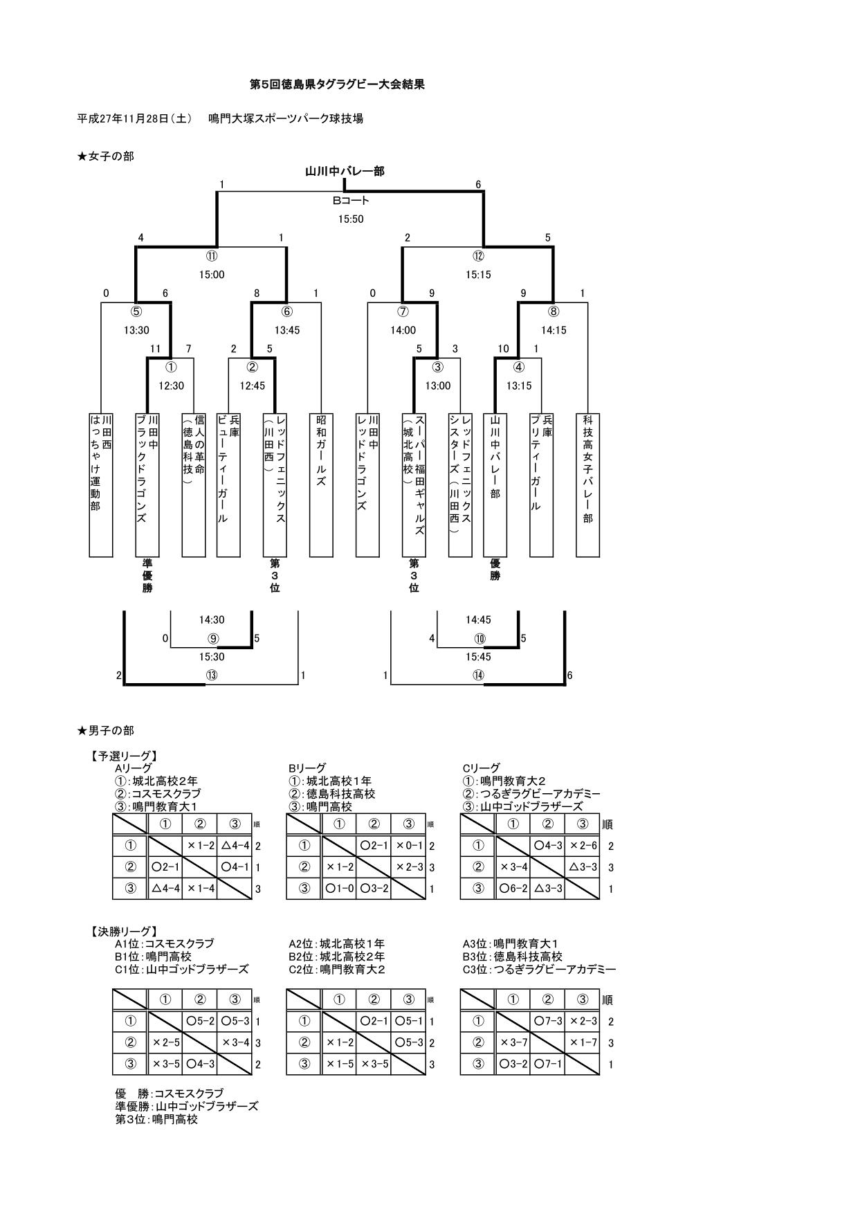 第5回徳島県タグラグビー大会結果(11月28日(土))を画像貼り付けします。
