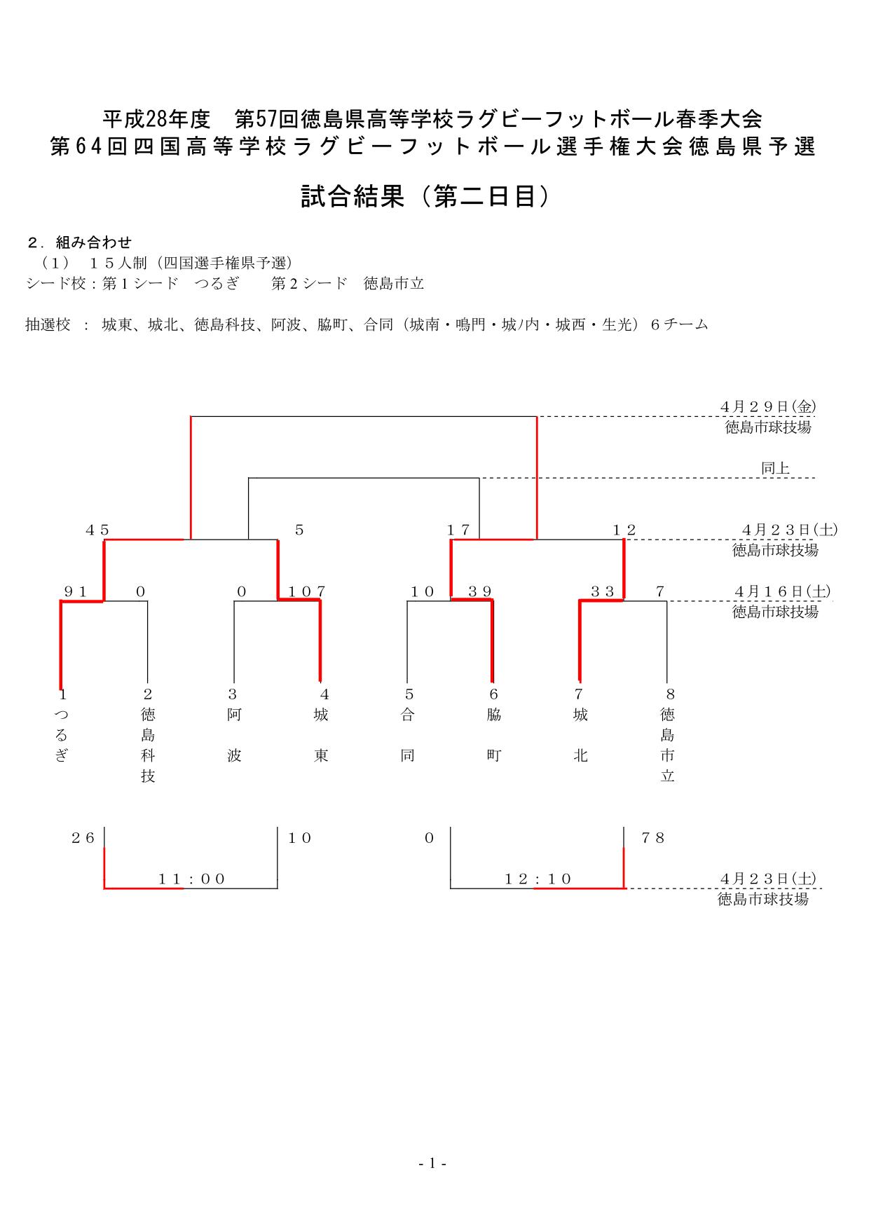 平成28年度 第58回徳島県高等学校ラグビーフットボール春季大会第64回四国高等学校ラグビーフットボール選手権大会徳島県予選 2016/04/23 徳島市球技場 2日目結果 敗者戦1 徳島科学技術26−10阿波 敗者戦2 徳島市立78−0合同 準決勝1 つるぎ45−5城東 準決勝2 脇町17−12城北 公式記録 http://rugby-tokushima.jp/2016_kiroku/koukou_syunki/20160423_koukou_2.pdf | |