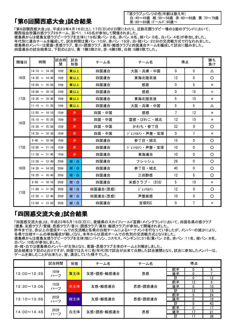 「第6回関西惑大会」は、平成23年4月16日(土)、17日(日)の2日間にわたり、近鉄花園ラグビー場の3面のグランドにおいて、 関西協会所属の惑クラブ26チーム、延べ1,145名が参加して開催されました。 徳島県からは徳島友惑ラグビークラブを主体に19名(黄パン:2名、赤パン:8名、紺パン:5名、白パン:4名)が参加しました。 年代別に連合チームを編成して、試合時間は黄パン:10分、赤パン:15分、白・紺パン:20分の交流戦方式で行なわれました。 徳島県のメンバーは愛媛・思惑クラブ、香川・讃惑クラブ、高知・鯨惑クラブと四国連合チームを編成して試合に臨みました。 四国連合の試合結果は、下記のとおり、黄:1勝3敗2分、赤:4勝3敗、白紺:5勝2敗でした。