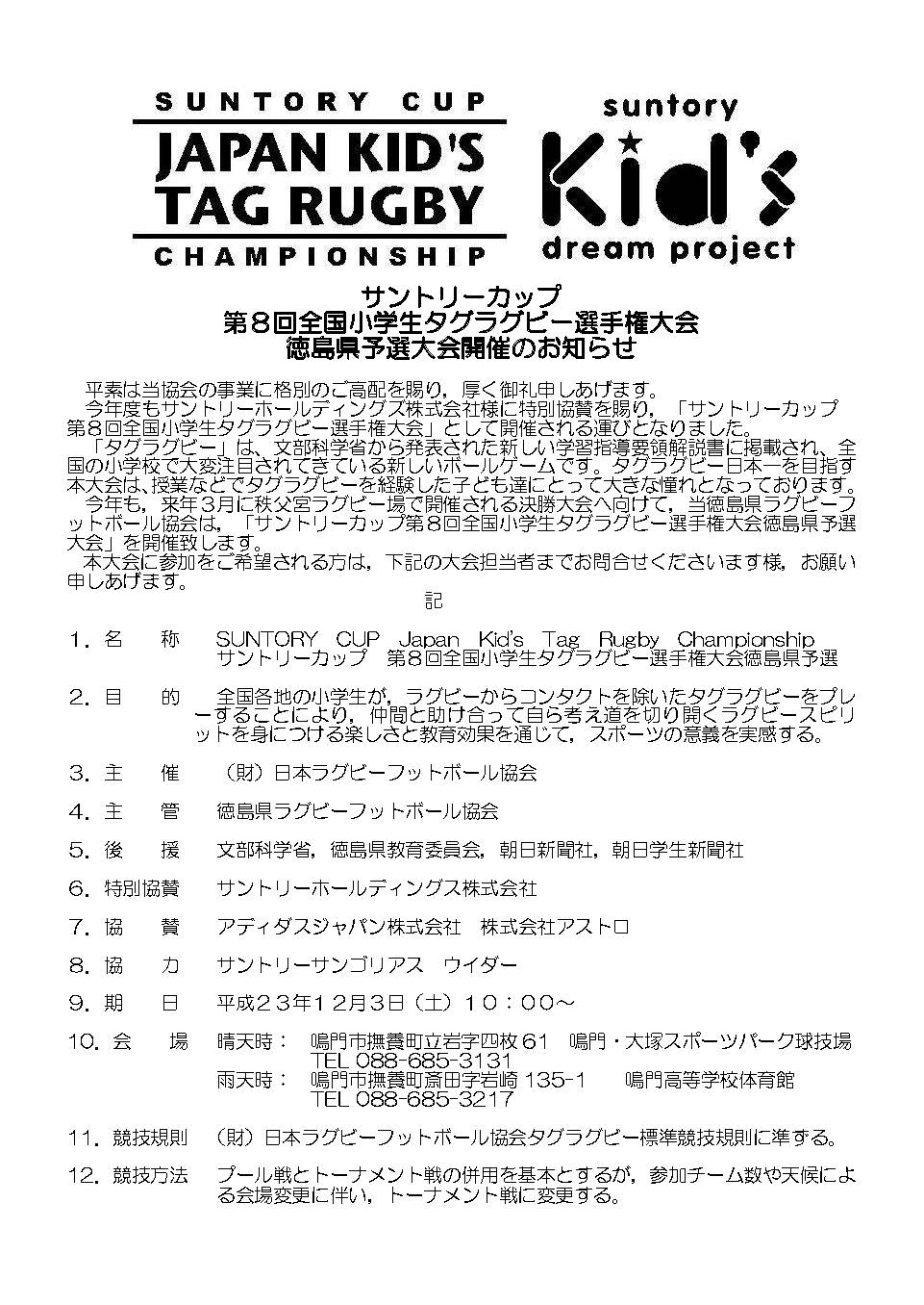 サントリーカップ第8回全国小学生タグラグビー選手権大会 徳島県予選大会開催のお知らせ 本大会に参加をご希望される方は,下記の大会担当者までお問合せくださいます様, お願い申しあげます。 期日 平成23年12月3日(土)10:00〜 会場 大塚スポーツパーク球技場 詳しい内容は下記を参照ください。 http://www8.atpages.jp/~tokushimarugby/up/log/018.pdf 県予選大会事務局 遠 藤 芳 治 〒772-0041 徳島県鳴門市大津町大代1210 大津西小学校 TEL(088)686-3509 FAX(088)685-6664 本年度からメールで参加チーム数を申し込むことに なりました。お間違えのないようにお願いいたします。 Mail tagtokushima@yahoo.co.jp ※問い合わせなどにも,メールにて対応いたしますのでよろしくお願いいたします。 | |