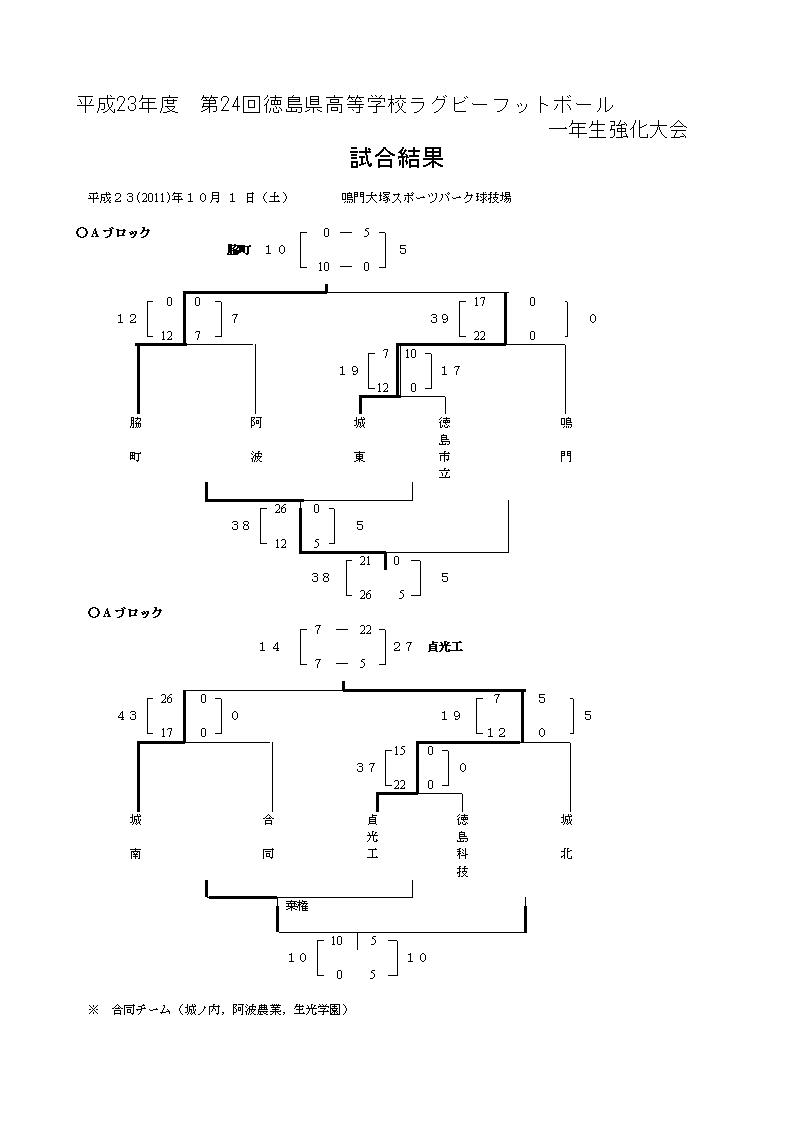 10月1日(土)鳴門球技場で実施された「平成23年度徳島県高等学校ラグビーフットボール1年生強化大会」の結果を掲載します。